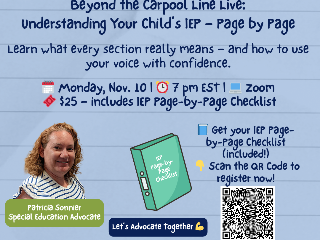 From one parent to another — these live Zoom sessions are a safe space to learn, ask questions, and build confidence navigating your child’s IEP or 504 Plan.